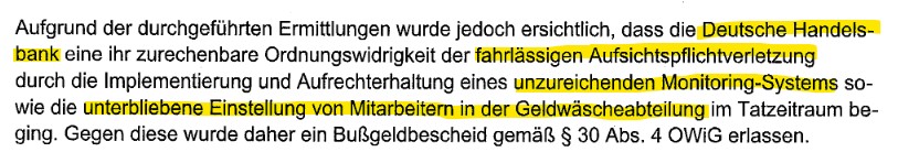 The investigations by the public prosecutor’s office in Munich have shown that Deutsche Handelsbank committed a regulatory offense by failing to implement and maintain an adequate monitoring system and by failing to recruit employees in the money laundering department during the period of the offense. A fine of one million euros was therefore imposed.